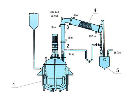 主要部件示意圖:1、反應(yīng)鍋 2、豎式分餾柱 3、豎式冷凝器 4、臥式冷凝器 5、貯水器。