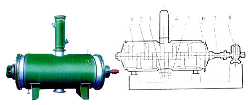 1、殼體  2、耙齒  3、出料裝置  4、加料裝置  5、粉碎棒  6、密封裝置  7、攪拌軸  8、傳動裝置